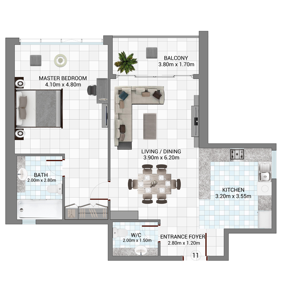 The tower has a total of 22 floors, out of which 18 are residential floors. It offers a mix of 360 units with 1BR, 2BR and 3BR configurations along with 8 commercial shops and 2 office spaces.