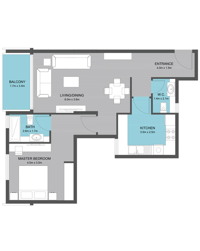 The Type B-1 floor plan at Muweileh Community offers a spacious 1 bedroom apartment in Sharjah, ideal for students, academics, and young professionals who want extra room near University City. With 1,050 sq. ft. of space, it features a large living/dining area opening to the balcony, a separate kitchen with guest W.C., and a comfortable master bedroom with attached bath, all within a building that also provides 24/7 security and maintenance, outdoor swimming pool, parking, and separate ladies’ and gents’ gym.