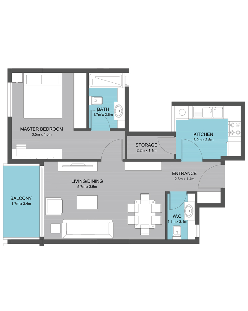The Type B-2 floor plan at Muweileh Community offers a spacious 1 bedroom apartment in Sharjah, ideal for students, academics, and young professionals who want extra storage and living space near University City. With 940 sq. ft., it features a large living/dining area opening to the balcony, a separate kitchen, guest W.C., dedicated storage room, and a comfortable master bedroom with attached bath, all within a building that provides 24/7 security and maintenance, outdoor swimming pool, parking, and separate ladies’ and gents’ gym.