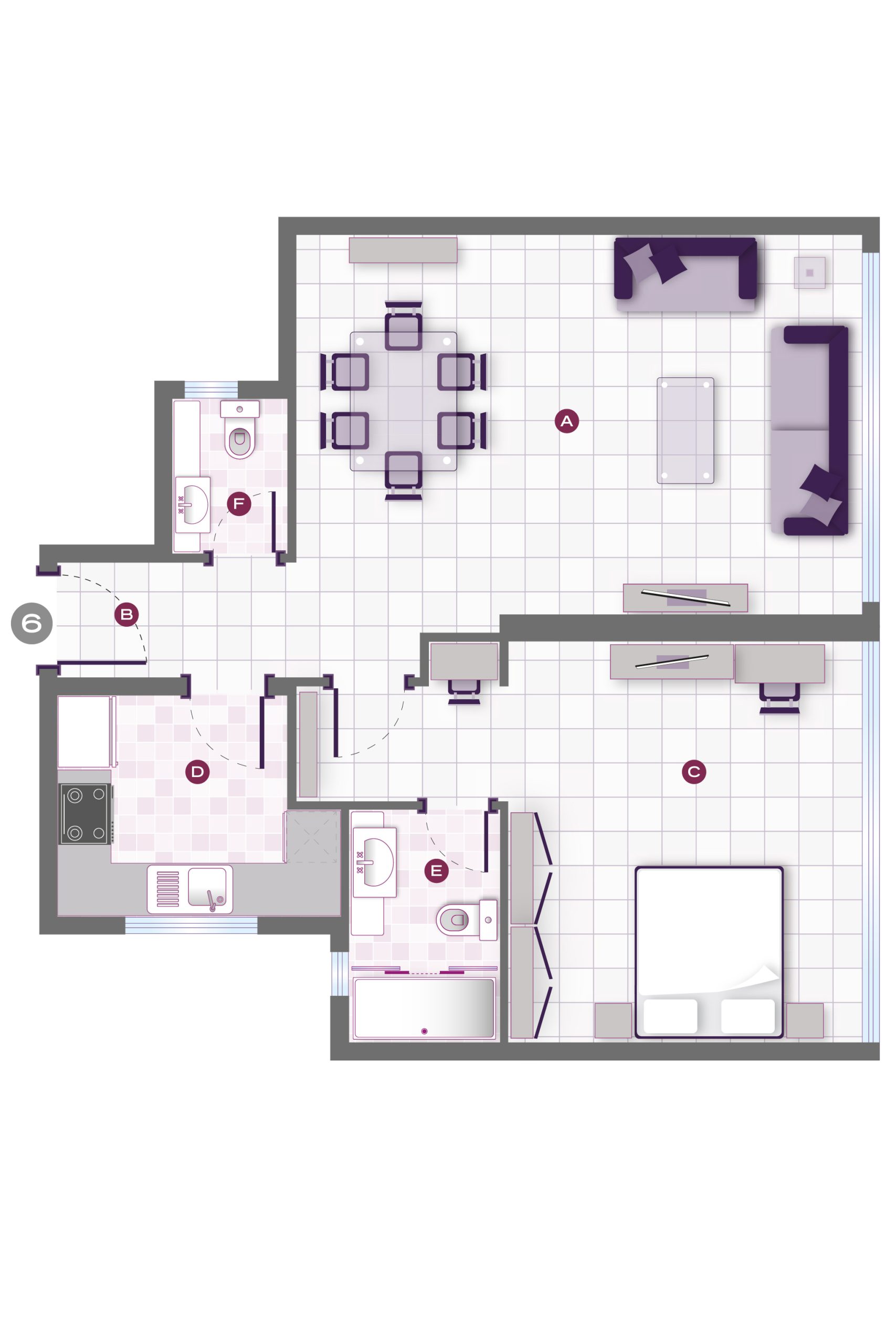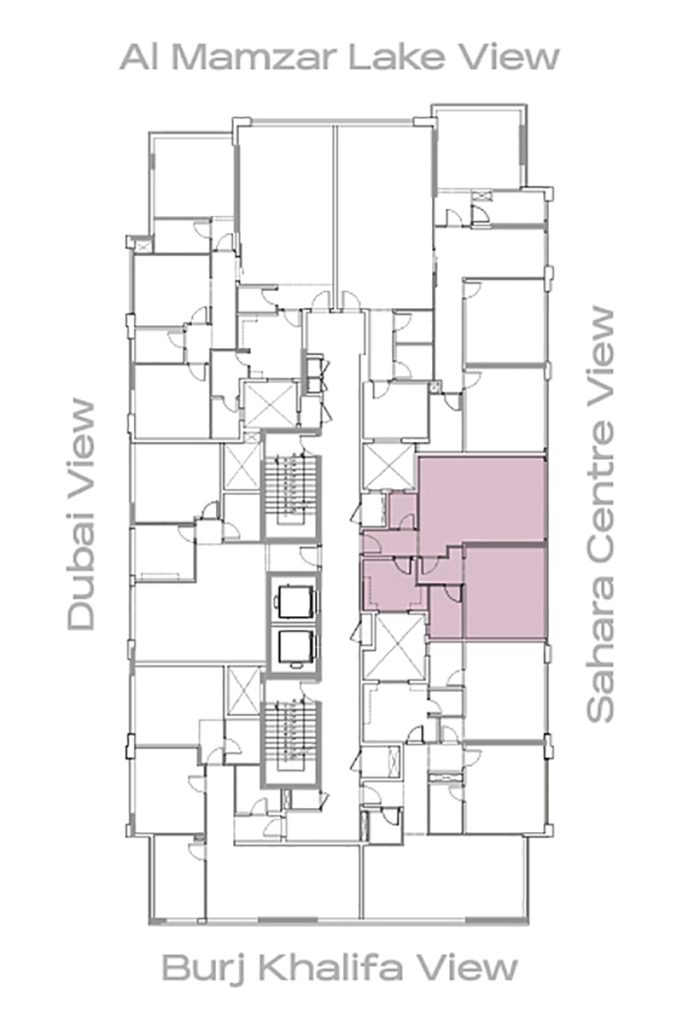 The 1BR Type B-6 floor plan at Sahara Tower 6 offers a practical 1,000 sq.ft. layout in Al Nahda, Sharjah. A large open living and dining area sits at the front of the apartment, giving plenty of room for a full sofa setup and family dining table. The enclosed kitchen is located just off the entrance, while the bedroom is set on the quieter side with built-in wardrobes and easy access to the main bathroom. A separate guest washroom near the living area makes this one-bedroom ideal for singles or couples who like to host without compromising privacy.