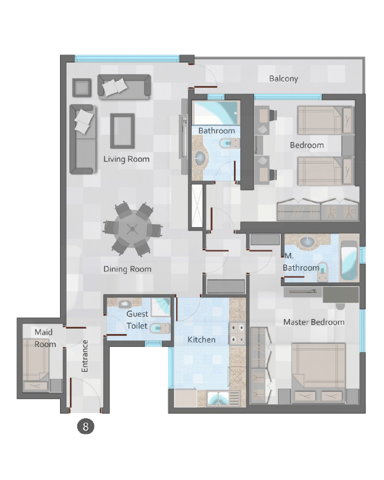 Future Tower 3 is another high-rise residential tower built on the bustling yet conservative neighborhood of Al Khan, Sharjah. The area is home to many retail establishments as well as the headquarters of renowned commercial institutions like Petrofac and Bank of Sharjah. The Al Ikhlas mosque, Viva supermarket, hotels and restaurants are also nearby.