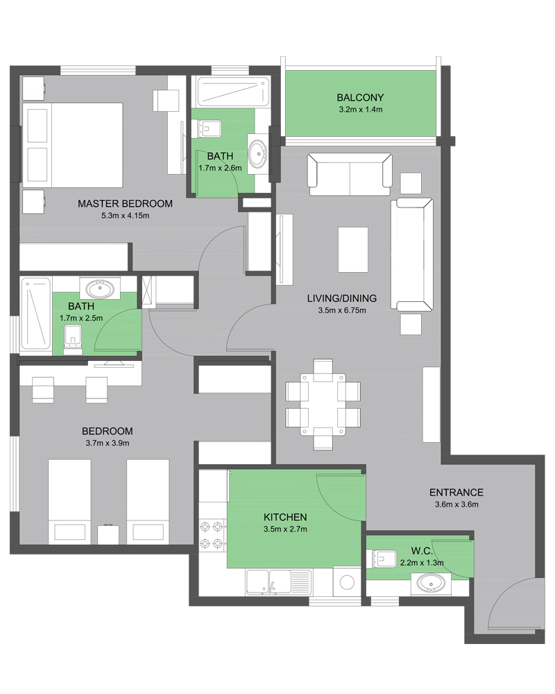 The Type A-2 floor plan at Muweileh Community offers a generous 2 bedroom apartment in Sharjah, ideal for families or sharers who want more space near University City. With 1,420 sq. ft., it features two well-sized bedrooms (including an en-suite master), two full bathrooms plus guest W.C., a separate kitchen, and a spacious living/dining area opening to the balcony, all within a building that provides 24/7 security and maintenance, an outdoor swimming pool, parking, and separate ladies’ and gents’ gym.