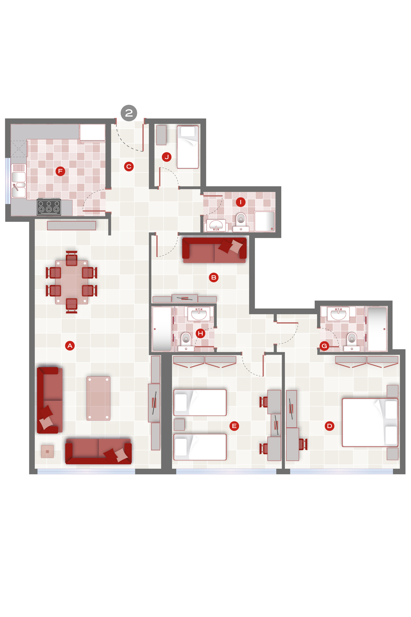 The 2BR Type A-2 floor plan at Sahara Tower 6 offers around 1,865 sq.ft. of family-friendly space in Al Nahda, Sharjah. A large open living and dining area runs along the front of the apartment, with an enclosed kitchen nearby plus a maid’s room and bathroom for added convenience. A separate bedroom wing houses two well-sized bedrooms, each positioned close to its own bathroom and built-in wardrobes, giving everyone privacy and comfort. With three bathrooms, generous circulation, and clearly defined living and sleeping zones, this layout is ideal for young families or professionals who want space to host, work, and relax.