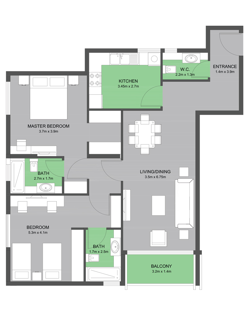 The Type A-5 floor plan at Muweileh Community offers a spacious 2 bedroom apartment in Sharjah, ideal for families or sharers who want a comfortable home close to University City. With 1,430 sq. ft., it features two well-sized bedrooms, two bathrooms plus a guest W.C., a separate kitchen, and a generous living/dining area opening to the balcony, all within a building that provides 24/7 security and maintenance, an outdoor swimming pool, parking, and separate ladies’ and gents’ gym.