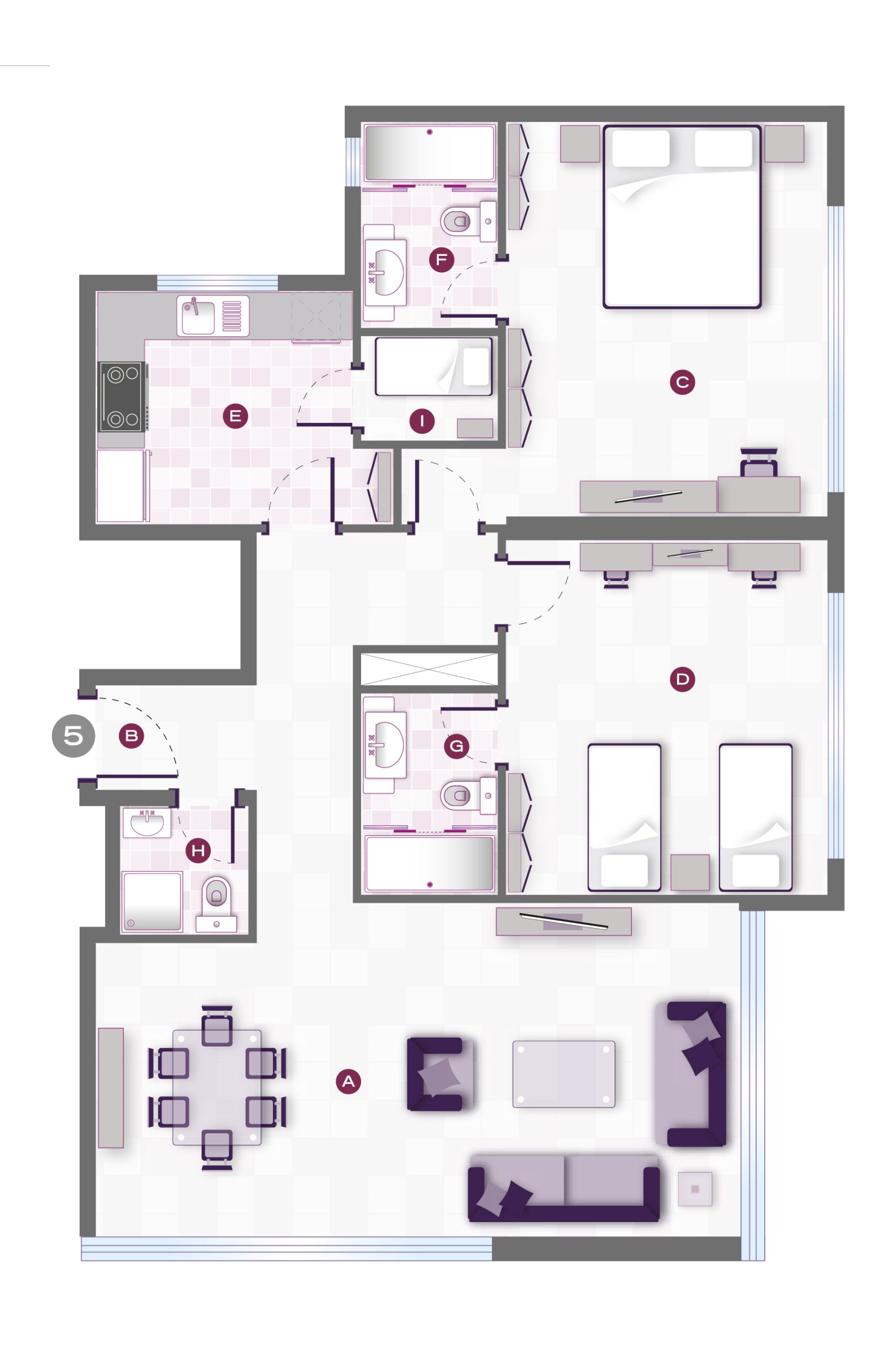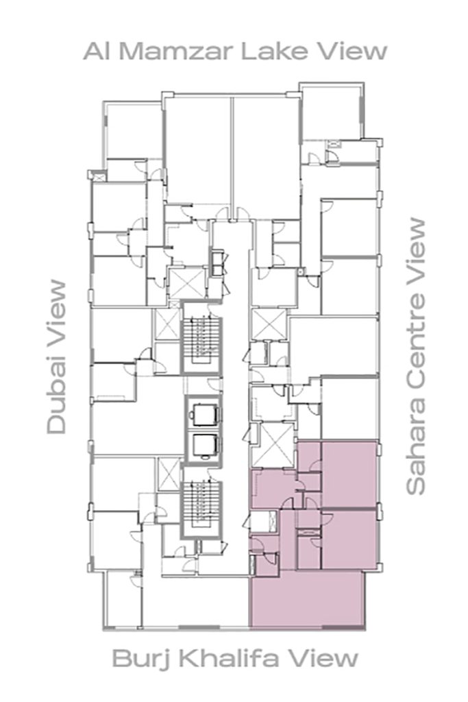 The 2BR Type B-5 floor plan at Sahara Tower 6 offers around 1,590 sq.ft. of well-planned space in Al Nahda, Sharjah. A bright open living and dining area with large windows forms the main social zone, with a practical enclosed kitchen and guest bathroom near the entrance. Both bedrooms are grouped along the quieter side of the apartment, with the master bedroom enjoying an en-suite bath and wardrobes and the second bedroom close to its own bathroom, plus a small extra room that can work as storage, maid’s room, or study. This three-bath layout suits families or sharers who want privacy, flexibility, and a comfortable space to host.