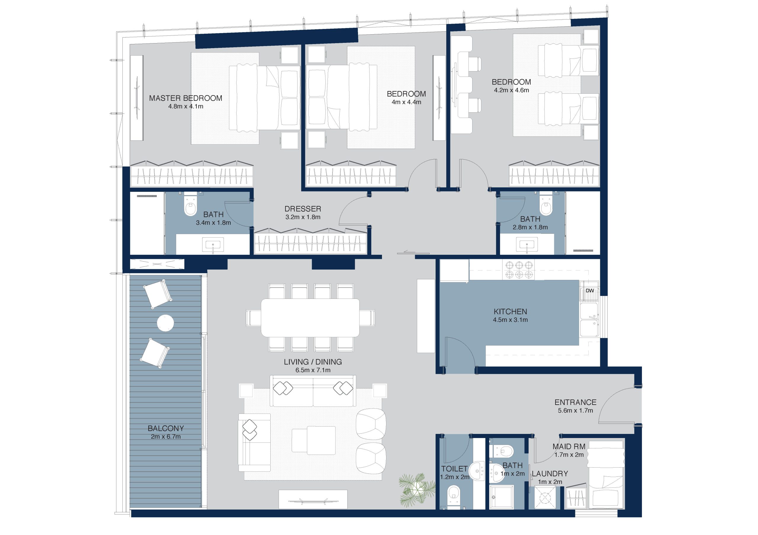 Framed by large windows, this bright and modern 3 bedroom apartment (from 9th to 31st floor) captures uninterrupted views of the Al Mamzar waterfront. It’s a soothing space designed for both comfort and connection to nature.