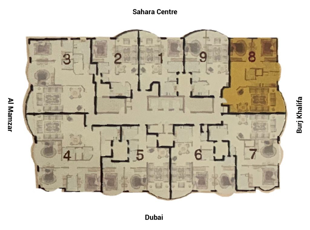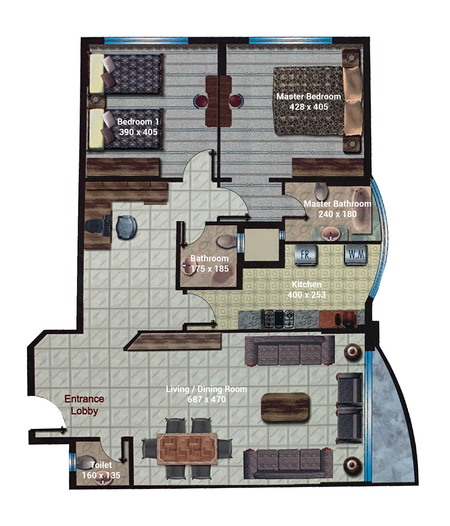 The 2BR – Type 8 floor plan at Sahara Tower 1 is a spacious 1,585 sq. ft. two-bedroom apartment in Al Nahda, Sharjah, ideal for small families. An entrance lobby opens into a large living and dining area with access to the curved balcony, while a separate closed kitchen with laundry space sits beside the master suite. The layout features a generous master bedroom with en-suite bathroom, a well-sized second bedroom near the shared bathroom, plus a guest toilet for added convenience.