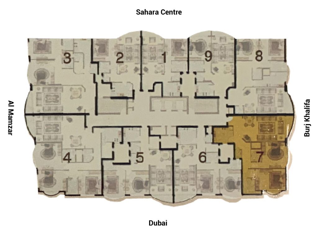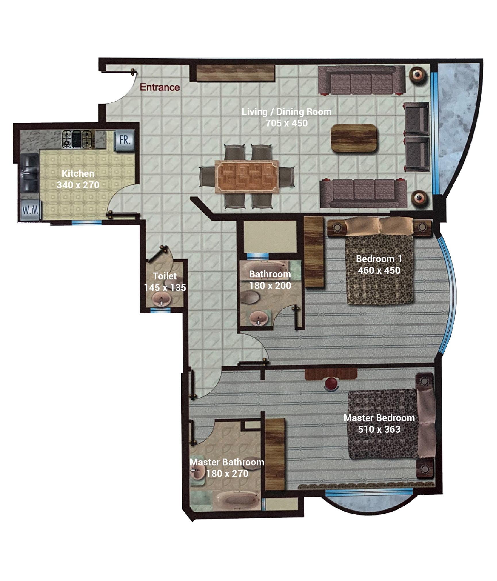 The 2BR – Type 7 floor plan at Sahara Tower 1 is a spacious 1,650 sq. ft. two-bedroom apartment in Al Nahda, Sharjah, ideal for small families who want generous living space. The entrance opens to a large living and dining room with access to the curved balcony, while a separate closed kitchen sits just off the hallway with a nearby guest toilet. The layout includes a comfortable master bedroom with en-suite bathroom, a well-sized second bedroom next to the shared bathroom, and a practical circulation area that keeps the bedrooms quietly tucked away from the main living zone.